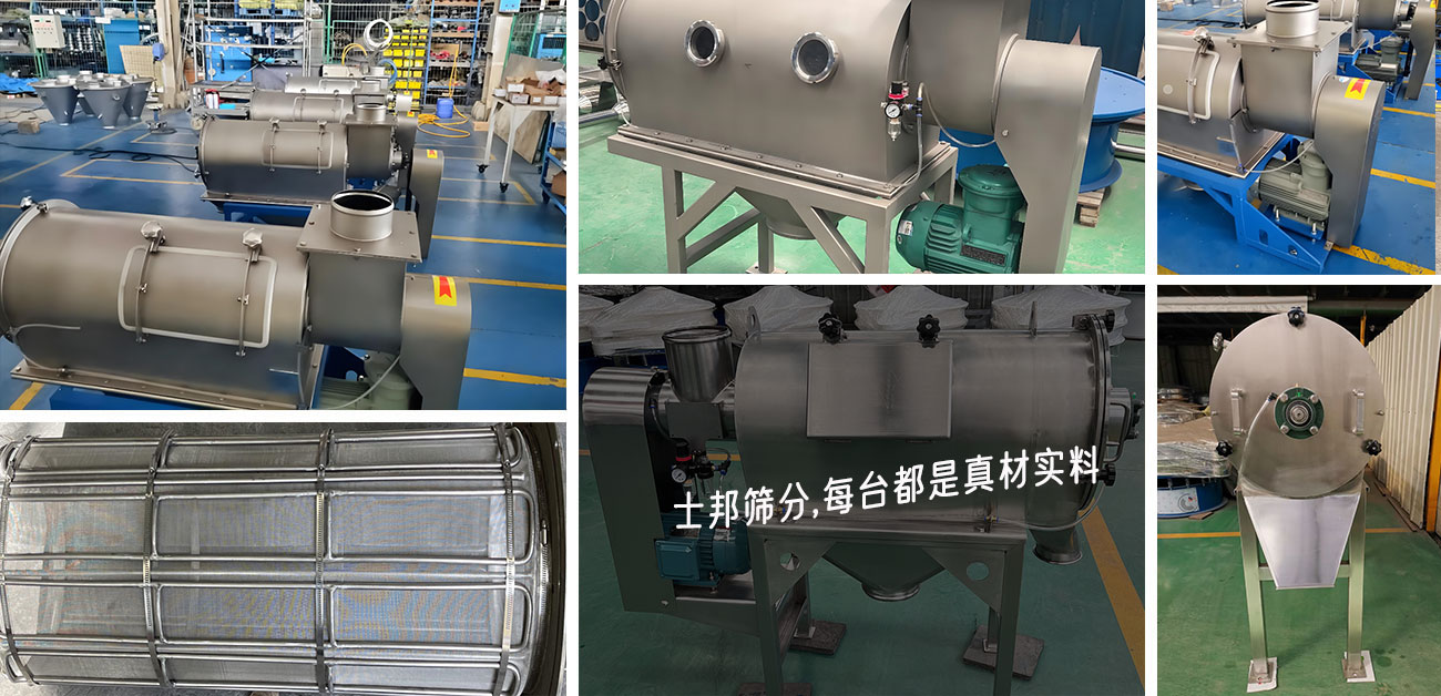 SQL卧式气流振动筛筛网为圆筒状,置于机体内,物料通过螺旋输送系统后,和气流混合、雾化进入网筒内;通过网筒内风轮叶片使物料同时受离心力和旋风推进力,从而能使物料喷射过网,由细料排出口排出,不能过网的物料沿网筒壁从粗料排出口排出。
